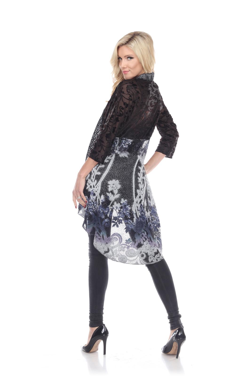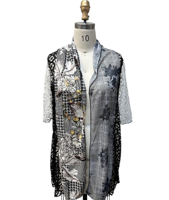 3/4 Sleeve Mixed Fabric Novelty Open Front Cardigan by Kamana; Washable 80% Viscose/20% Polyester In Black/Grey Sizes S-M-L-XL(2-2-2-2)
