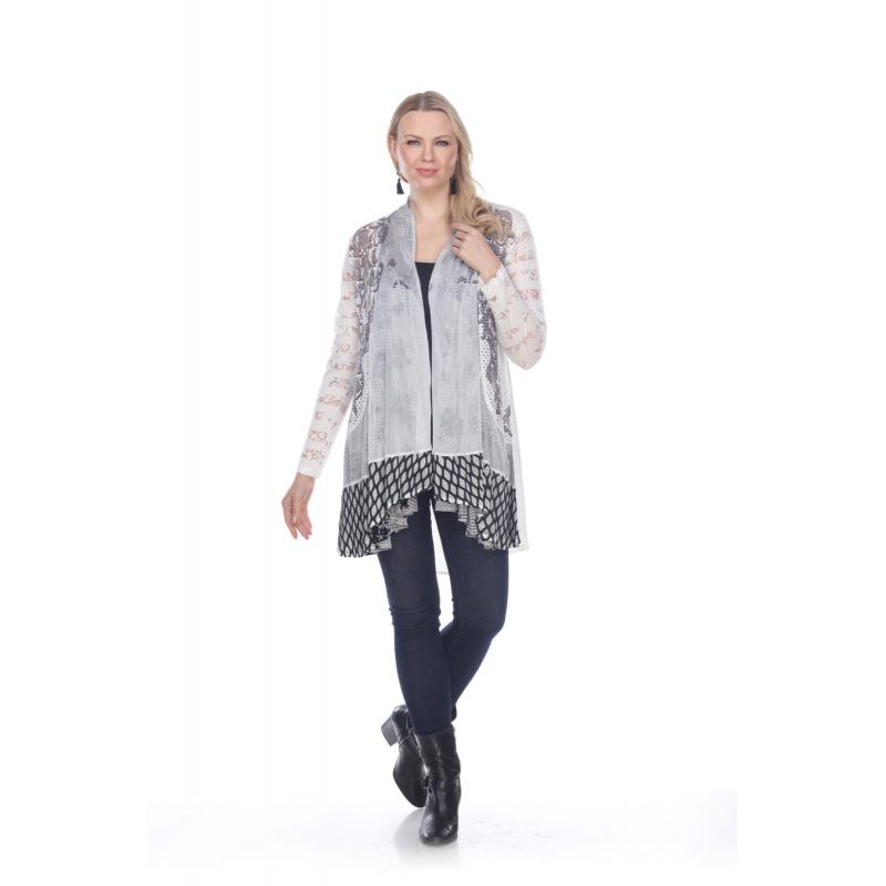Short Sleeve Mixed Fabric Novelty Open Front Lace Cardigan by Kamana; Washable 80% Rayon/20% Polyester In White Multi Sizes S-M-L-XL(2-2-2-2)