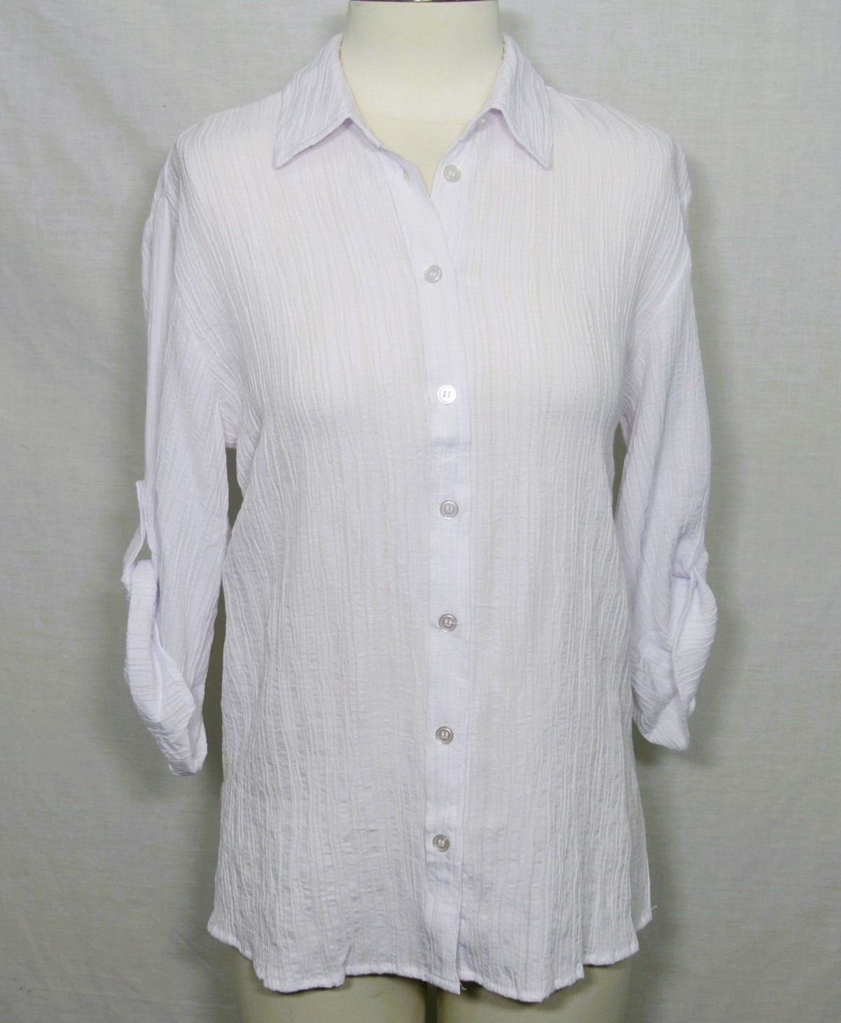 Button Front Roll Tab Sleeve Textured Solid Blouse by Runway Ready;