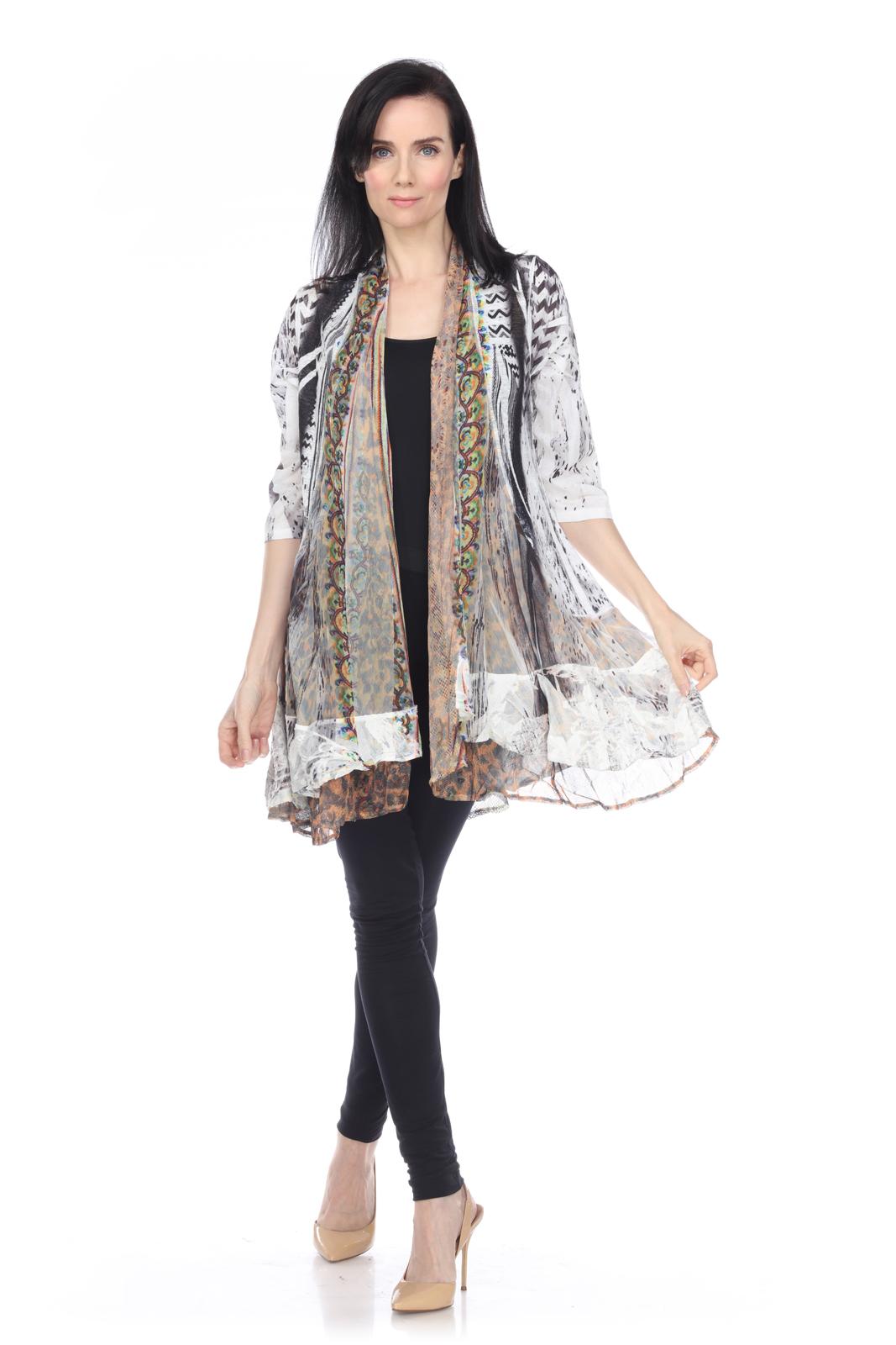 3/4 Sleeve Mixed Fabric Novelty Open Front Cardigan by Kamana; Washable 80% Viscose/20% Polyester In Multi Sizes S-M-L-XL(2-2-2-2)
