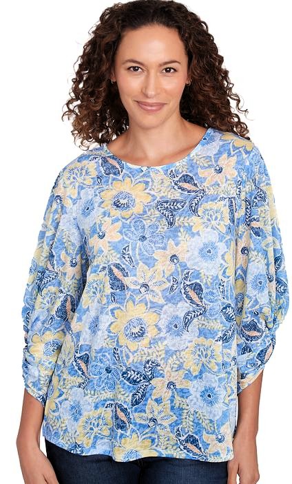 3/4 Rouched Sleeve Novelty Print Hacci Top by Ruby Rd;