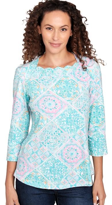 Embroidered 3/4 Sleeve Print Scallop Neck knit Top by Ruby Rd;