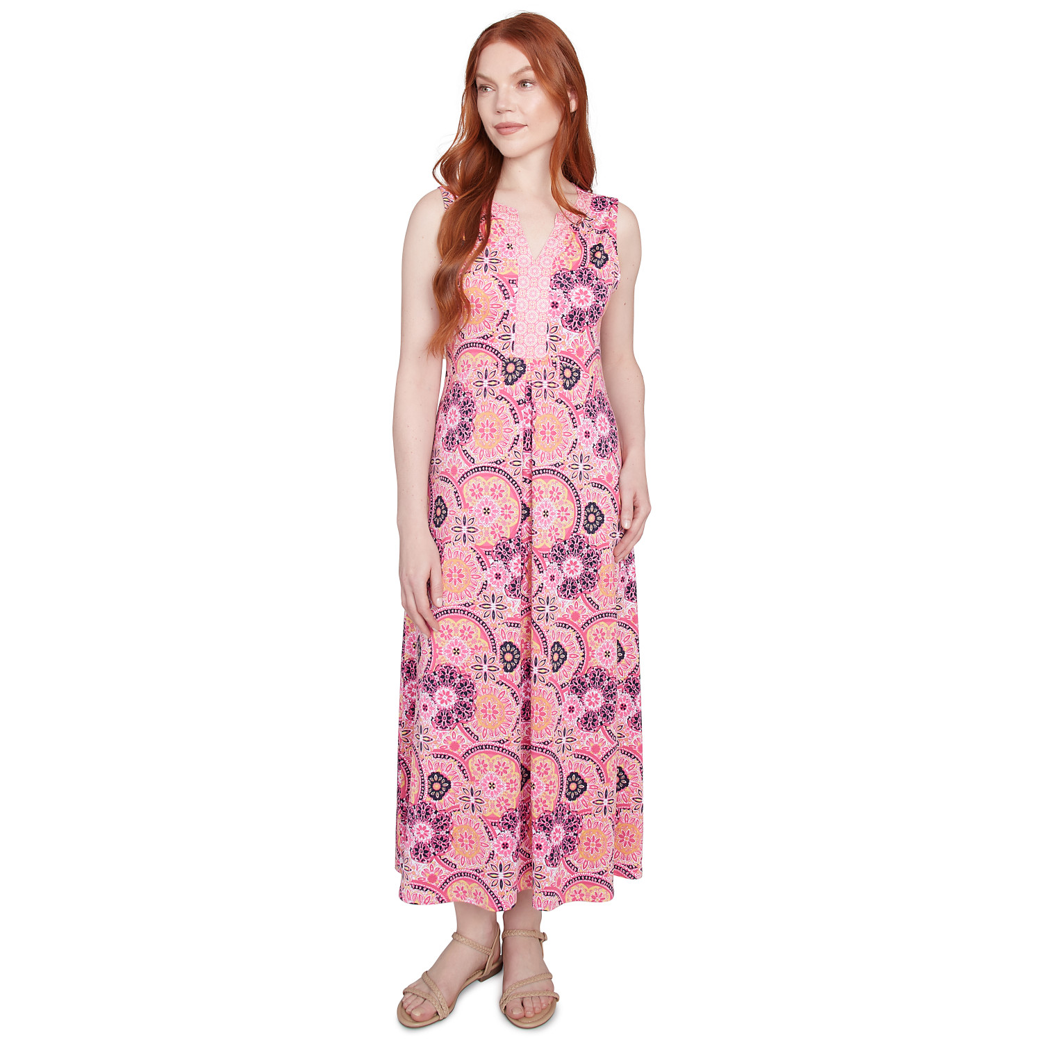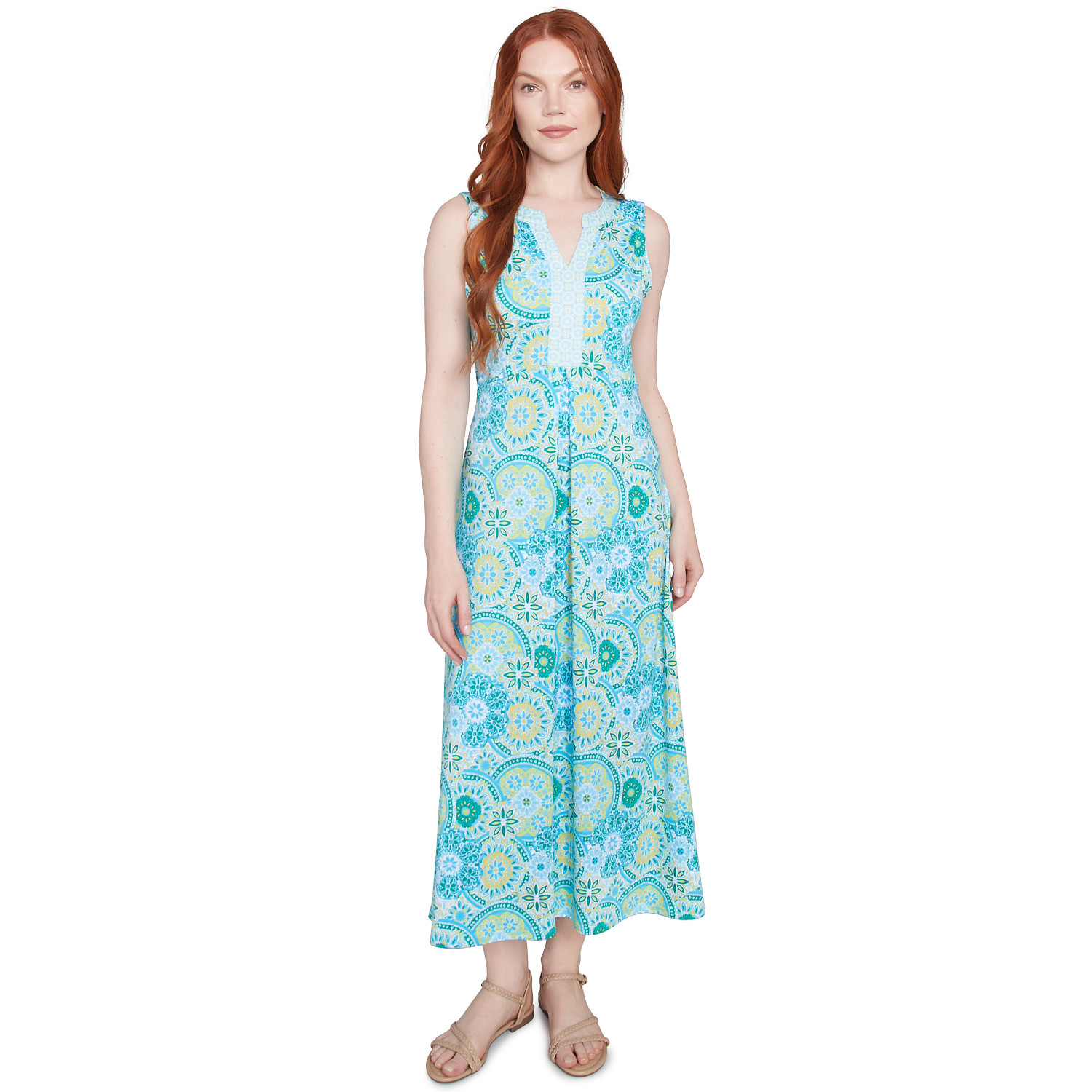 This sleeveless maxi dress is perfect for a relaxed and stylish look. The contrasting split neckline adds a touch of sophistication, while the vibrant medallion print and comfortable knit fabric make it a must-have.