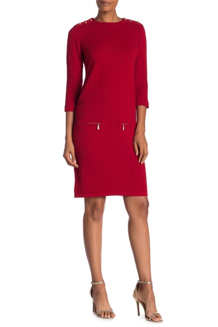 3/4 Sleeve Textured Knit Zip Pocket Dress by Joan Vass; In Red