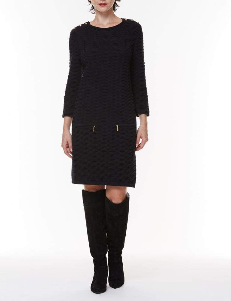 3/4 Sleeve Textured Knit Zip Pocket Dress by Joan Vass; In Black