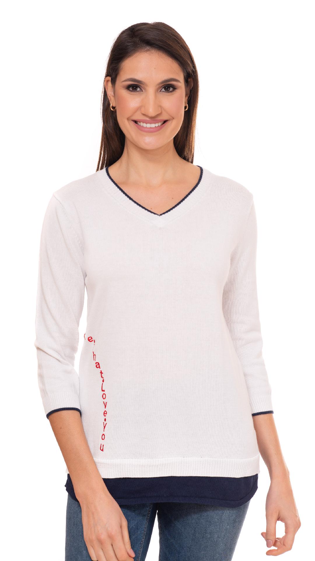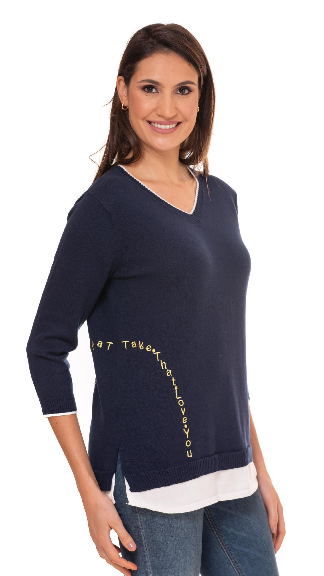 Embroidered Long Sleeve Latered Look V Neck Sweater With Tipping Detail by Vecceli Italy;